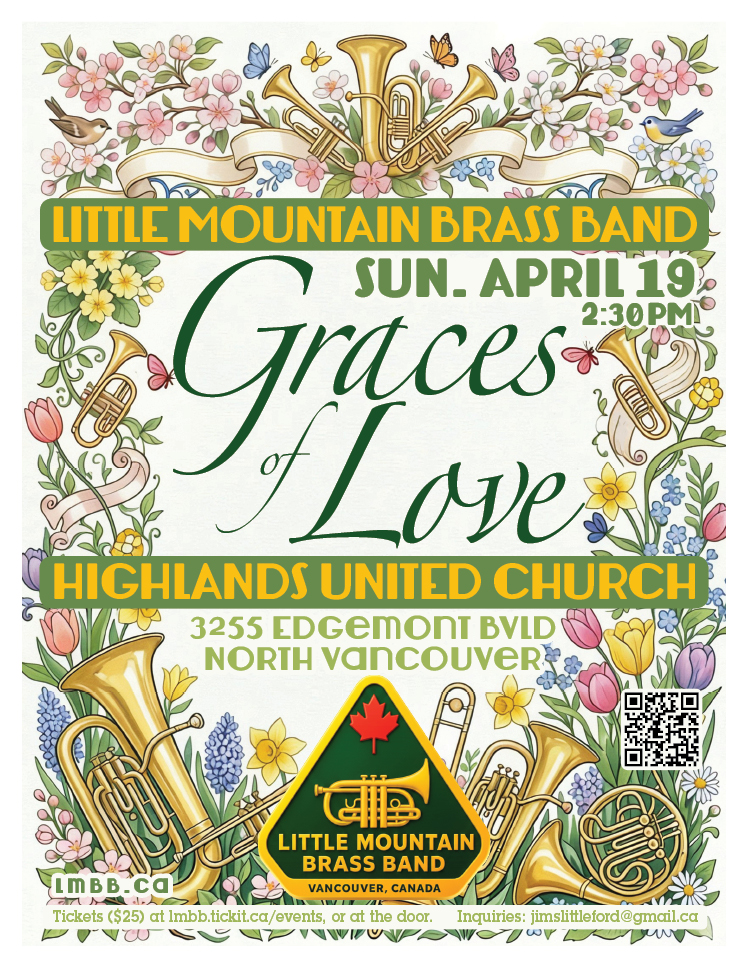 Little Mountain Brass Band presents a Winter Concert on Sunday, December 12, 2:30PM, at Marpole United Church, 1296 West 67th Ave, Vancouver. No admission charge, but donations will be gratefully accepted.